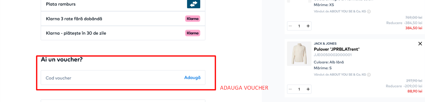 Acceseaza site-ul aboutyou.ro sau aplicatia mobila, alege articolele preferate si adauga-le in cos. Verifica daca sunt eligibile pentru reducere.