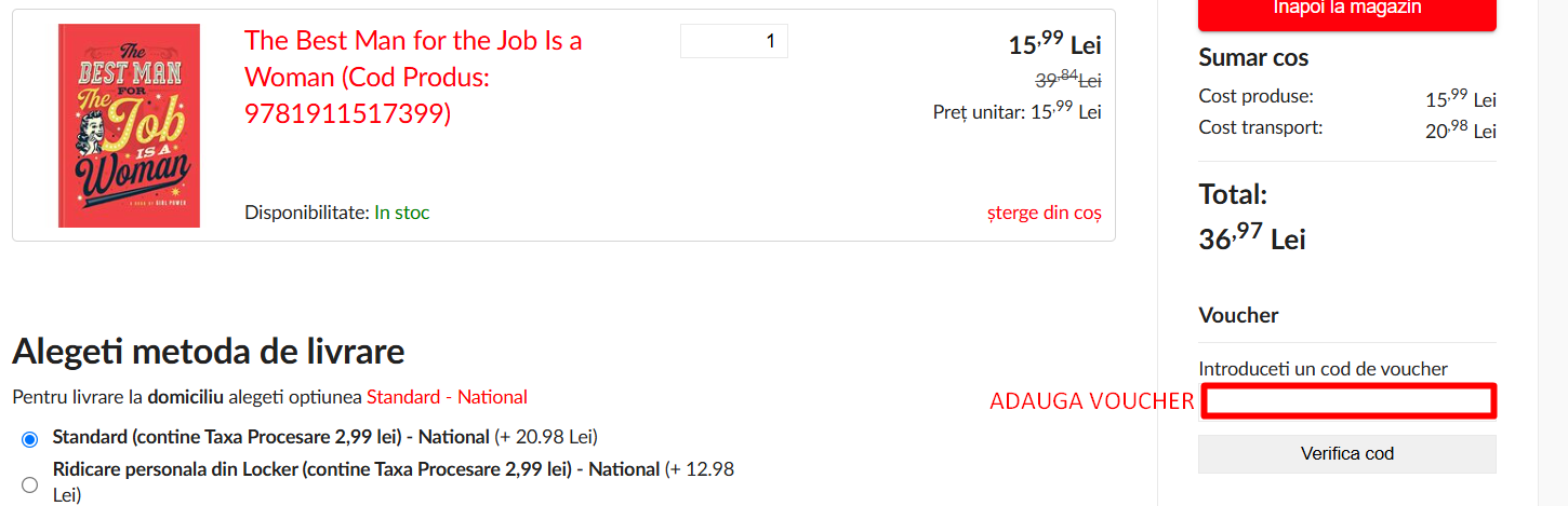 Gaseste campul special pentru „Cod reducere” sau „Voucher” si introdu codul pe care il ai (de exemplu, C10 pentru 10% reducere la comenzi de peste 150 lei).