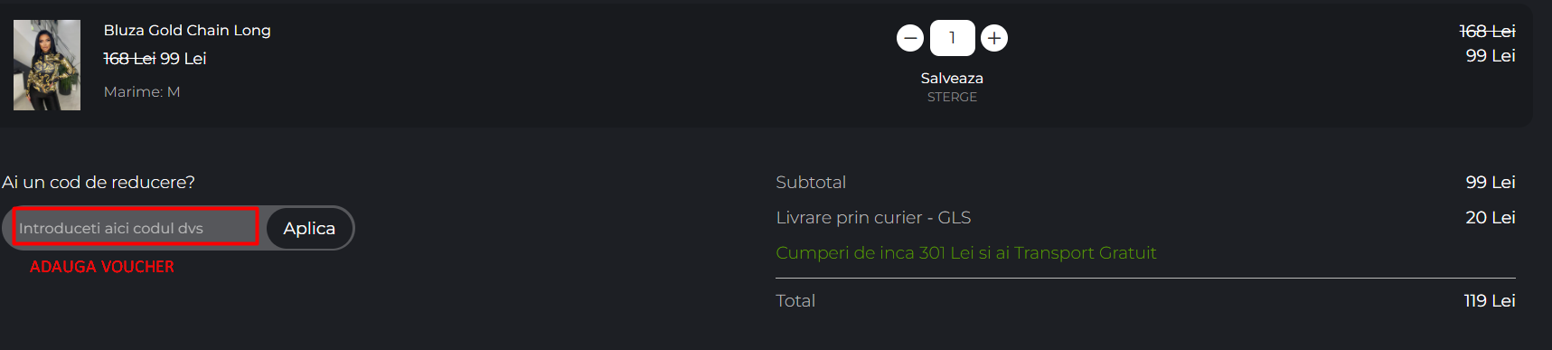 Dupa ce ati introdus codul, apasati butonul "Aplica" pentru a valida reducerea. Verificati daca reducerea a fost aplicata corect la totalul comenzii.