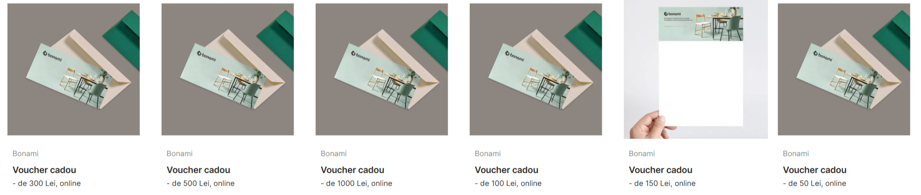 Bonami ofera vouchere cadou intr-o gama variata, perfecta pentru a face un cadou special. Acestea sunt disponibile atat in format fizic, livrate prin posta, cat si in format electronic, care sunt trimise pe e-mail imediat dupa achitare. Voucherele pot fi cumparate pentru sume variate, iar optiunile includ valori de 50 lei, 100 lei, 150 lei, 300 lei, 500 lei si 1000 lei.