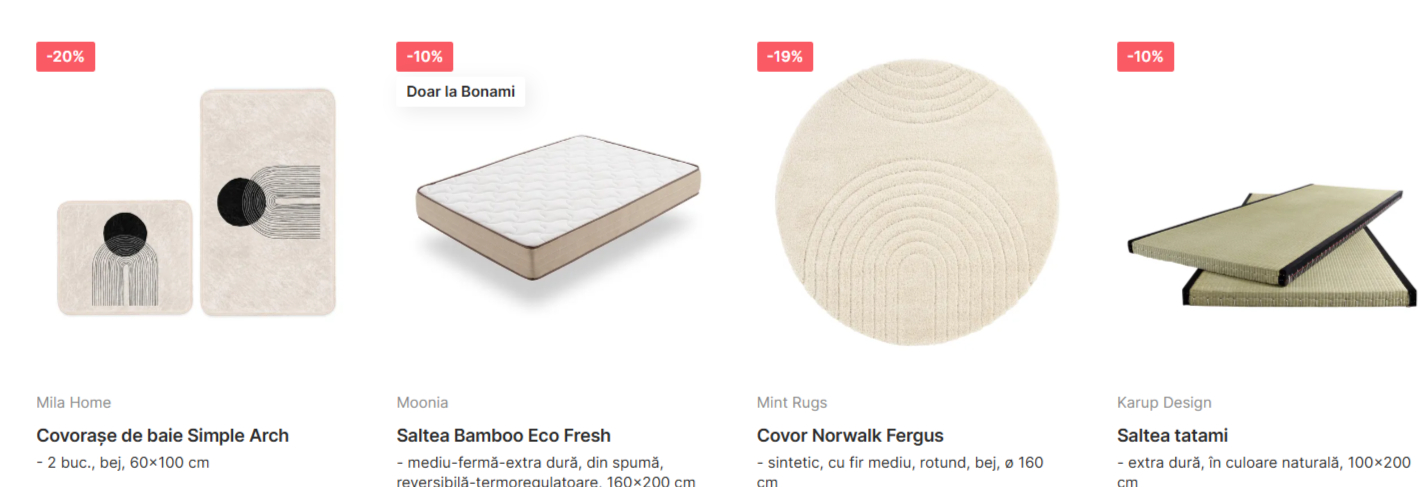 In categoria textilelor, Bonami are reduceri atragatoare. Setul de doua covorase de baie Simple Arch, marca Mila Home, a fost redus cu 20%, de la 179 lei la 143,20 lei. De asemenea, covorul pentru copii Animal Park de la Hanse Home, in dimensiunea 160x235 cm, beneficiaza de o reducere de 12%, ajungand de la 311,32 lei la 271,50 lei.