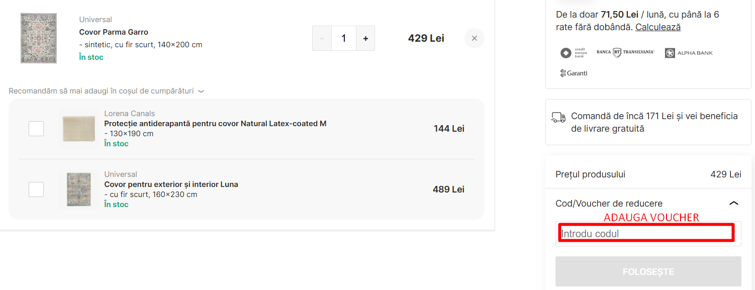 In pagina cosului de cumparaturi, vei gasi un camp special pentru „Cod de reducere”. Introdu codul pe care l-ai primit si apasa butonul „Aplica”.