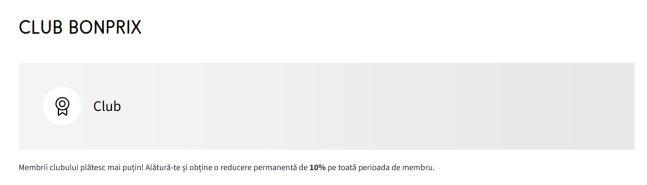 Clubul Bonprix este un program de fidelizare care ofera membrilor sai o reducere de 10% la fiecare comanda plasata in perioada de valabilitate a calitatii de membru. Aceasta reducere se aplica cumulativ cu alte promotii existente, permitand astfel economii suplimentare la achizitiile efectuate.