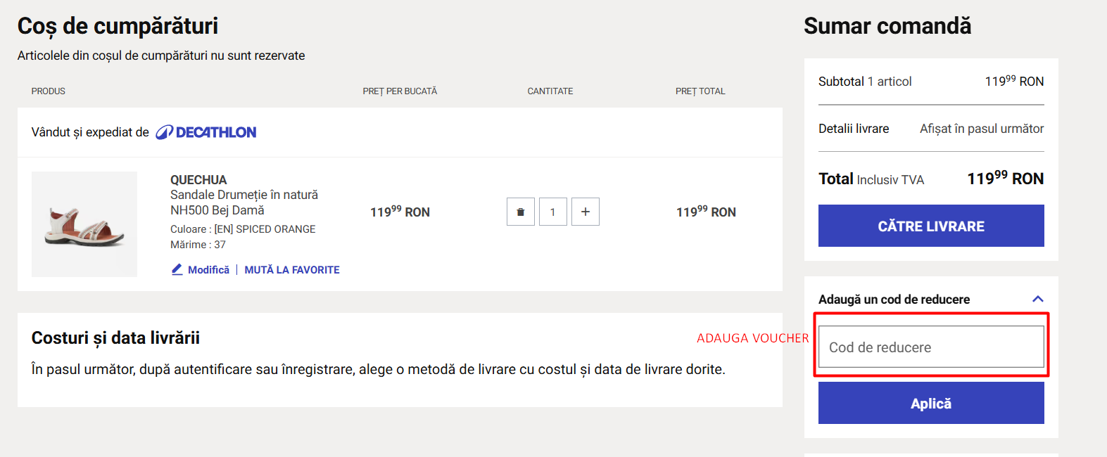 Dupa aplicarea cod reducere, verificati daca reducerea a fost aplicata corect la totalul comenzii. Continuati procesul de finalizare a comenzii, autentificandu-va in contul existent sau creand unul nou, selectand metoda de livrare si modalitatea de plata dorita.