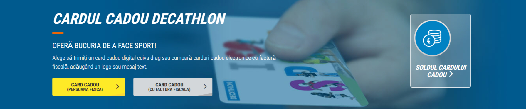 Cardul Cadou Decathlon este un voucher digital care poate fi incarcat cu sume intre 50 si 1.000 de lei. Acesta poate fi utilizat atat in magazinele fizice Decathlon din Romania, cat si pentru achizitii online pe site-ul oficial. Valabilitatea cardului este de 2 ani de la data achizitiei, permitand utilizarea sumei in una sau mai multe transe, in functie de preferintele beneficiarului.