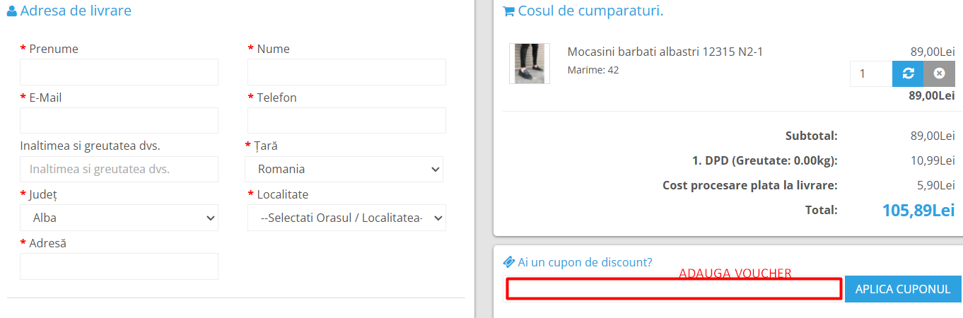Verifica daca reducerea a fost aplicata corect si continua cu procesul de plata si livrare. Codul de reducere va fi dedus automat din totalul comenzii tale.