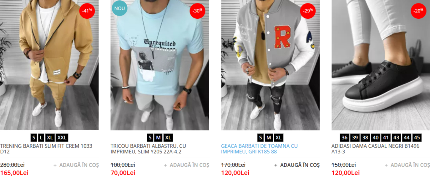 Pe Dehaine.ro, vei gasi o varietate de produse la pret redus, inclusiv camasi din bumbac si materiale premium cu reduceri de pana la 40%. Tricourile casual si de ocazie beneficiaza de reduceri intre 30-50%, iar blugii si pantalonii eleganti sau casual sunt disponibili cu reduceri de pana la 60%. Gecile de iarna, jachetele impermeabile si vestele au reduceri de 40-50%, iar hanoracele din materiale moi si confortabile pot fi achizitionate cu reduceri de 30-40%. De asemenea, seturile de treninguri sunt disponibile cu reduceri de pana la 45%, iar curelele si bretelele au reduceri de pana la 30%.