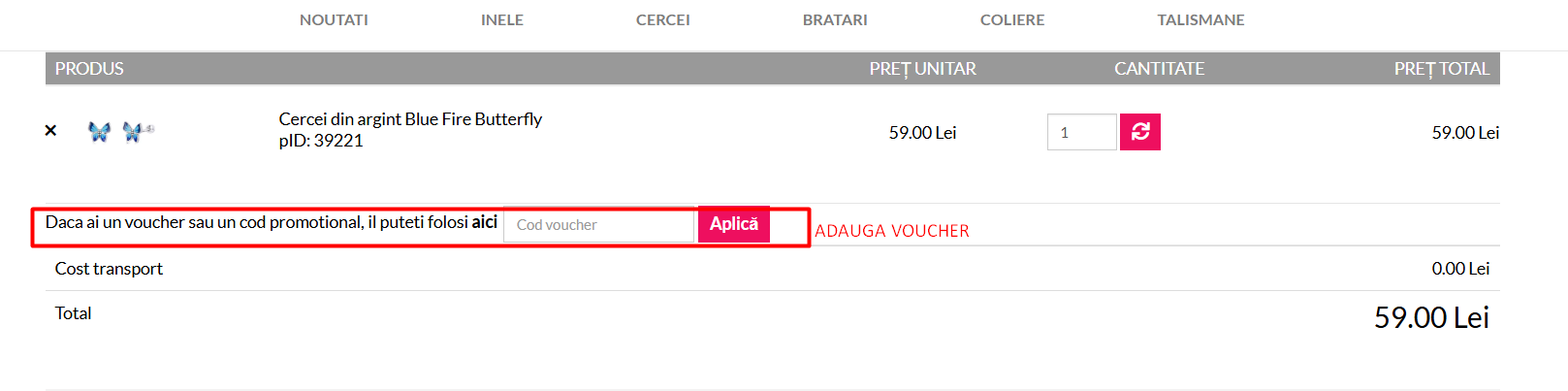 In pagina cosului de cumparaturi, sub lista produselor selectate, veti gasi un camp dedicat pentru codul de reducere, etichetat ca "Cod voucher" sau similar. Introduceti codul in acest camp si apasati butonul "Aplica voucher" pentru a activa reducerea.