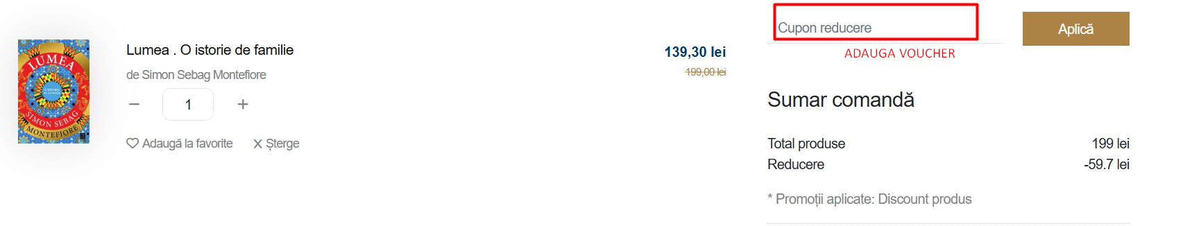 Folosirea unui cod de reducere este simpla: adaugi cartile dorite in cosul de cumparaturi, apoi, in pagina de finalizare a comenzii, vei gasi un camp numit „Cod de reducere” sau „Cupon”. Introduci codul primit, apoi dai click pe butonul „Aplica”. Reducerea va fi afisata imediat, inainte de plata. Daca codul este valid, se va aplica automat.