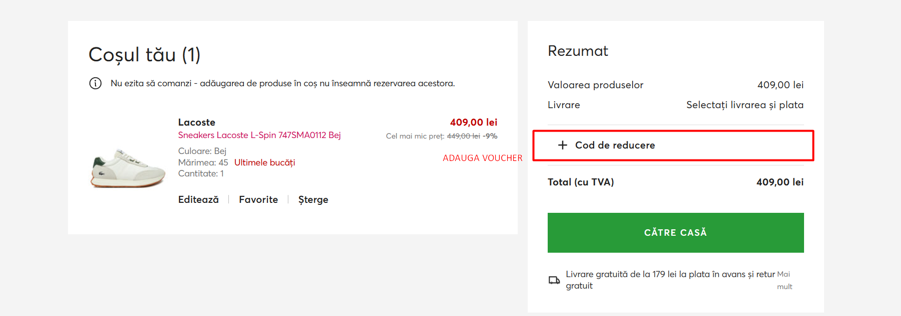 Dupa aplicarea codului, verifica detaliile comenzii si finalizeaza achizitia prin alegerea metodei de plata si livrare.