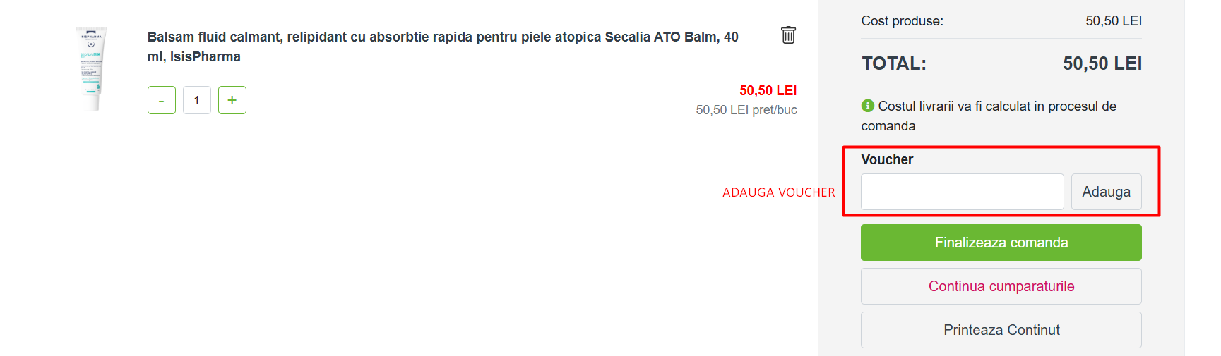 In pagina cosului de cumparaturi, sub lista produselor selectate, veti gasi un camp denumit „Voucher”. Introduceti cod reducere in acest camp si apasati butonul „Adauga” pentru a aplica reducerea.