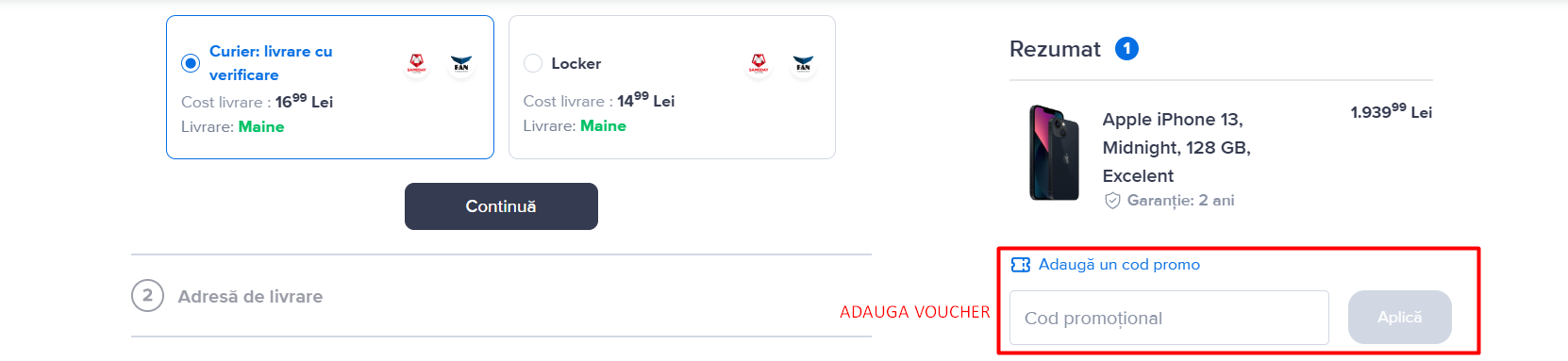In pagina cosului de cumparaturi, sub lista produselor selectate, veti gasi un camp denumit "Cod voucher" sau "Adauga un cod promo". Introduceti codul de reducere in acest camp si apasati butonul "Aplica" sau "OK" pentru a valida codul.