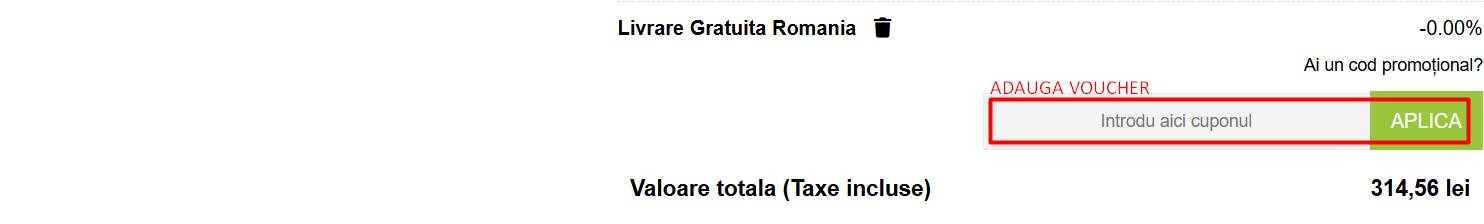 Dupa ce adaugi produsele dorite in cos, mergi in pagina de finalizare a comenzii (checkout). Acolo vei vedea un camp special unde poti introduce codul tau de reducere. Dupa ce il scrii, apasa pe butonul „Aplica”, iar reducerea se va calcula automat. Codurile de reducere pot oferi intre 10% si 30%, in functie de campania activa. Asigura-te ca este valabil si scris corect, fara spatii sau greseli.