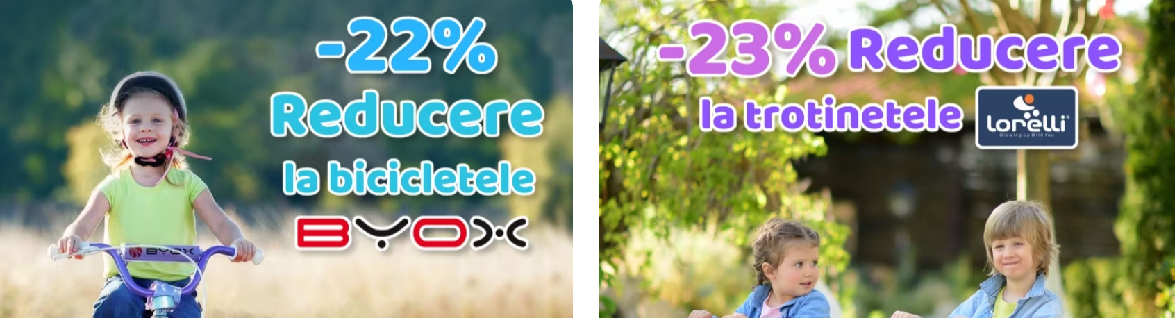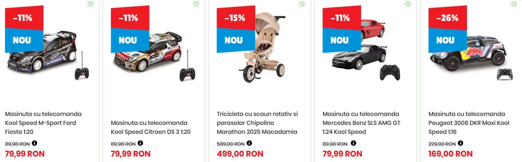 Cele mai frecvent reduse produse sunt cele din categoriile de jucarii (in special LEGO, Playmobil, Hot Wheels), articole de exterior (trotinete, biciclete, tobogane), articole pentru bebelusi (scaune auto, carucioare, patuturi) si haine pentru copii. Reducerile variaza intre 15% si 50%, iar in timpul campaniilor speciale pot ajunge chiar la 70%.