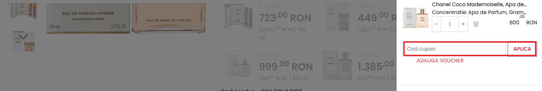 Dupa ce ati introdus codul, apasati butonul "Aplica" pentru a activa reducerea. Valoarea totala a comenzii se va actualiza automat, reflectand discountul aplicat.