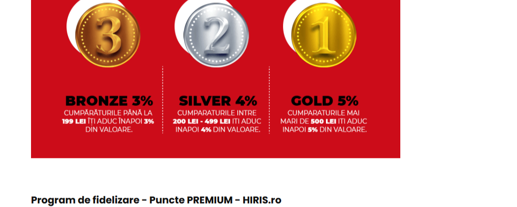 Da, HIRIS.ro ofera un program de fidelitate numit „HIRIS PREMIUM”, care recompenseaza clientii fideli cu puncte de loialitate la fiecare achizitie. La prima comanda, utilizatorii primesc un bonus de 10 lei in puncte de fidelitate. Incepand cu a doua comanda, punctele se acumuleaza astfel: 3% cashback pentru orice comanda, 4% pentru cosuri de peste 200 lei si 5% pentru comenzi de peste 500 lei.