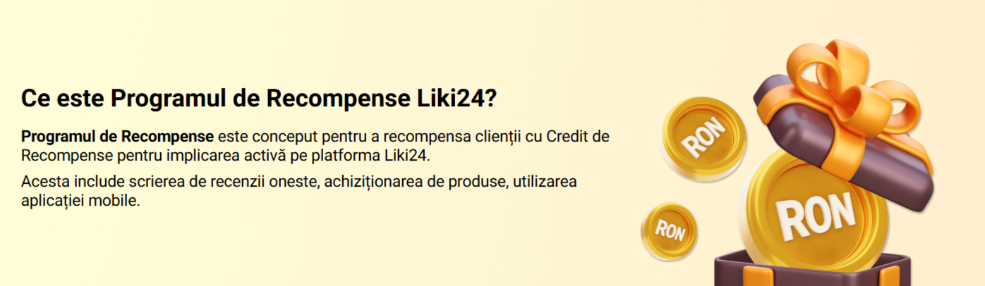 Liki24 are un program de recompense care permite clientilor sa acumuleze credite de reducere. De exemplu, pentru fiecare recenzie aprobata a unui produs achizitionat, utilizatorii primesc 3 RON in credit de recompensa. Aceste credite pot fi folosite la comenzile viitoare, ajutand la reducerea costurilor.