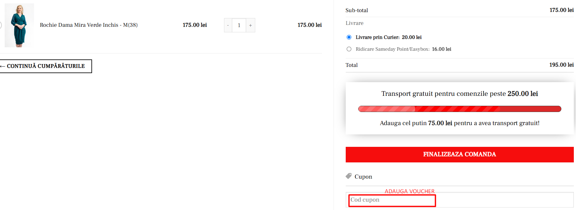 Aplica codul: Dupa ce ai introdus codul, apasa pe butonul "Aplica" pentru ca reducerile sa fie aplicate automat la totalul comenzii.