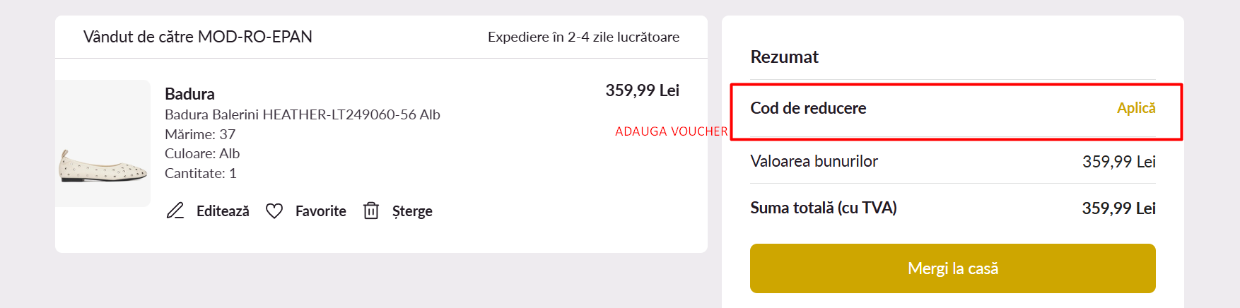 In pagina cosului, veti gasi un camp denumit "Adauga un cod reducere". Faceti clic pe acesta, introduceti codul si apasati "Aplica" pentru a activa voucherul.