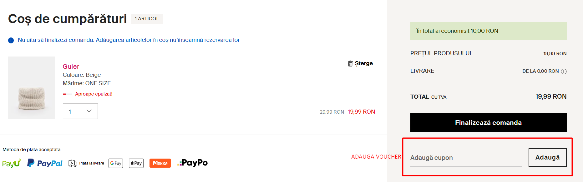 Dupa ce ai introdus codul, apasa butonul "Aplica" si verifica daca reducerea a fost scazuta din pretul total.
