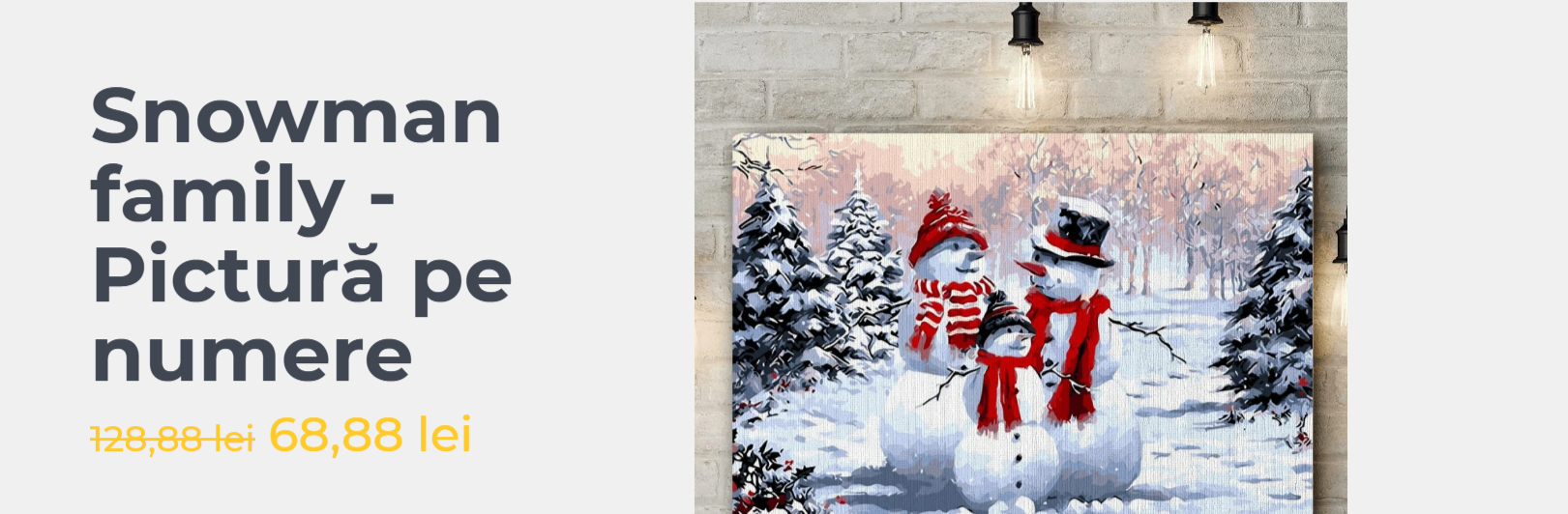 Pe PictorulFericit.ro, iubitorii de arta pot beneficia de reduceri semnificative la o gama variata de picturi pe numere. De exemplu, tabloul "Snowman family" este disponibil la pretul de 68,88 lei, redus de la 128,88 lei. Alte picturi, precum "Kazimir (Self portrait)" si "Unforgettable face (Alma Mahler)", sunt oferite la 49,88 lei, fata de pretul initial de 129,88 lei . In plus, colectia de picturi pe numere pentru 2024 include modele precum "Jumatate umbrit (Half hidden)" si "Al saptelea cer (7th Heaven)", disponibile la preturi reduse de la 128,88 lei la 47,88 lei.