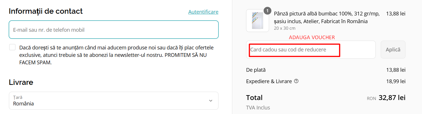 Un voucher pe PictorulFericit.ro este un cod promotional care poate fi utilizat pentru a obtine reduceri la produsele comandate. Aceste vouchere sunt disponibile periodic si pot oferi reduceri de pana la 20%. Pentru a folosi un voucher, adauga produsele dorite in cos, acceseaza pagina cosului de cumparaturi, introdu codul in campul „Cod reducere” si apasa „Aplica”. Reducerea se va aplica automat.