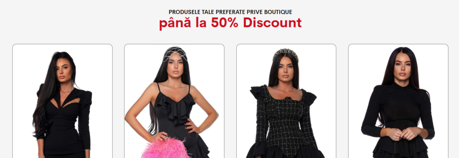 Pe Prive Boutique, clientii pot beneficia de oferte si reduceri exclusive la o gama larga de produse. In fiecare luna, magazinul organizeaza campanii de reduceri de pana la 50%, care includ atat rochii de ocazie, cat si alte articole vestimentare, precum fuste, pantaloni si bluze. Abonatii la newsletter primesc notificari pentru reduceri speciale, cu discounturi de pana la 70% in perioada Black Friday sau alte evenimente de shopping.