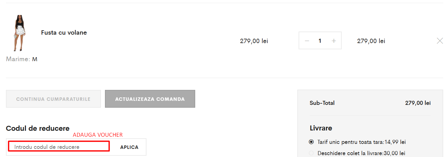 Dupa ce ai introdus codul de reducere, apasa pe butonul „Aplica” sau „Aplica reducerea” pentru ca suma totala a comenzii sa fie actualizata cu discountul oferit.