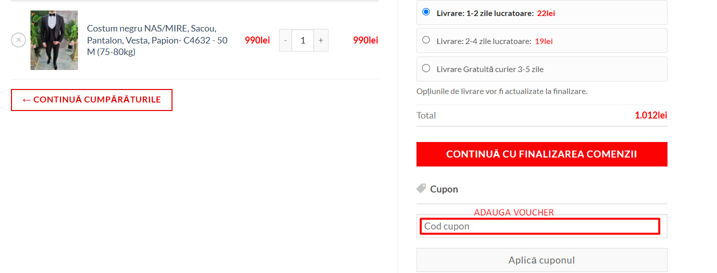 La pasul de finalizare a comenzii, introdu codul de reducere in campul denumit "Cod voucher / discount".