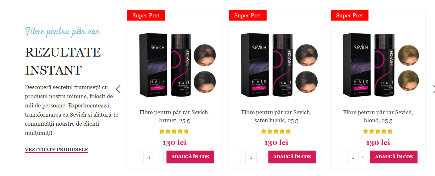 Pe Sevich.ro, clientii pot beneficia de oferte si reduceri exclusive la o gama variata de produse pentru ingrijirea parului si a barbii. De exemplu, in perioada 15-30 aprilie 2026, este disponibila o reducere de 15% la toate produsele din gama de fibre pentru par, cu preturi incepand de la 79 RON. De asemenea, pentru comenzile care depasesc 200 RON, se ofera livrare gratuita in toata Romania. In plus, clientii care se aboneaza la newsletter-ul Sevich.ro primesc un cod promotional de 10% reducere valabil la prima comanda.