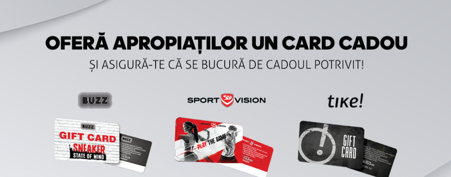Cardul Cadou Sport Vision este o modalitate flexibila si convenabila de a oferi cadouri celor dragi, permitandu-le sa-si aleaga produsele preferate din magazinele Sport Vision, Buzz Sneaker Station sau Tike. Acest card este nenominal si transmisibil, putand fi incarcat cu sume intre 50 lei si 2.500 lei, in multipli de 50 lei.