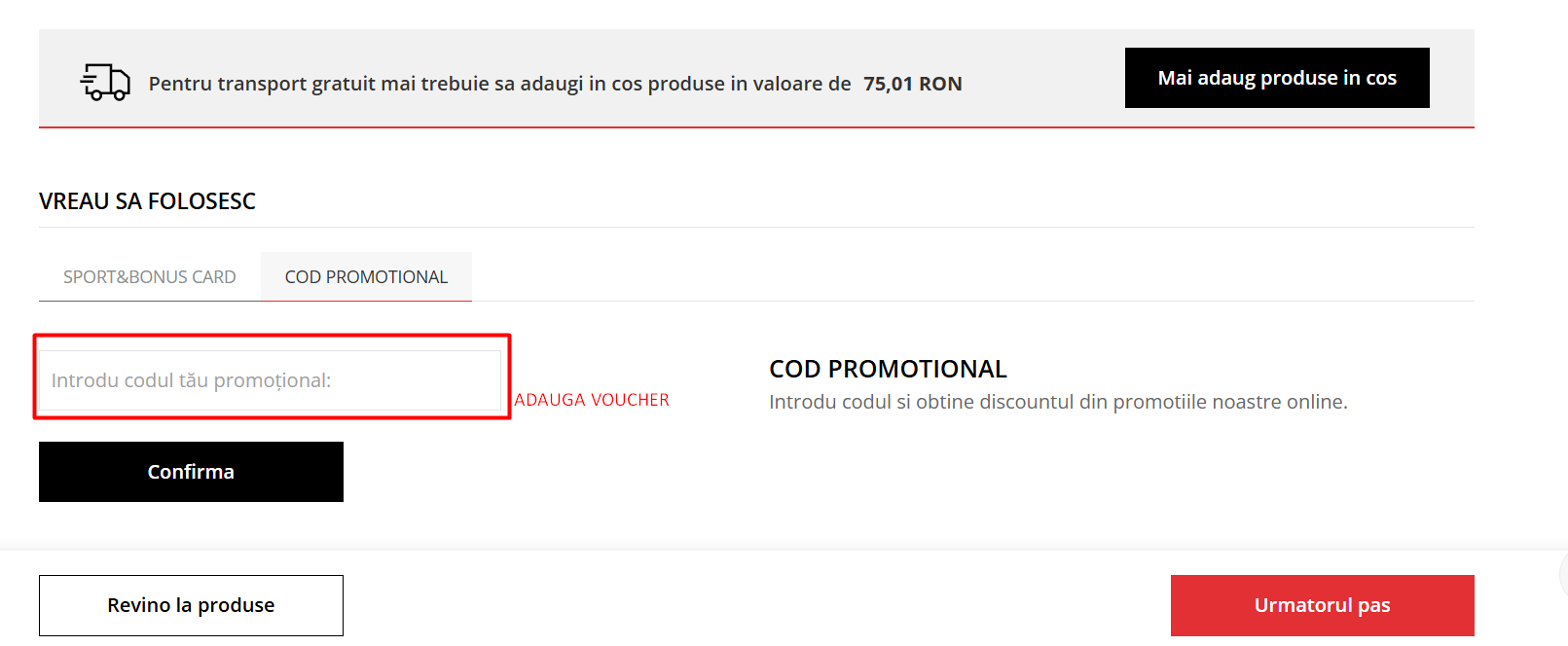 Dupa ce ati adaugat produsele dorite in cos, accesati cosul de cumparaturi. In sectiunea destinata codurilor promotionale, introduceti codul si apasati "Aplica" pentru a activa reducerea.