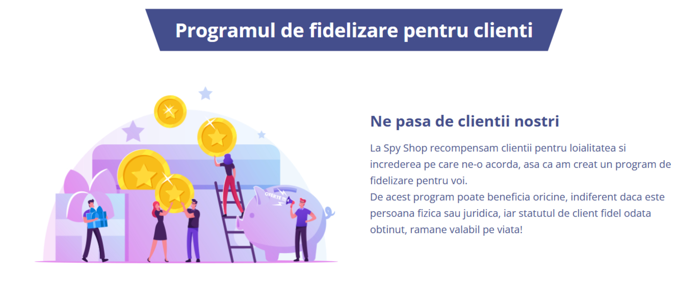 Programul de fidelizare Spy Shop este dedicat clientilor recurenti si ofera puncte de recompensa la fiecare achizitie. Pentru fiecare 1 RON cheltuit, clientul primeste 1 punct, iar la acumularea a 1.000 de puncte, acestia pot fi folositi pentru un discount de 10 RON la comenzile viitoare. Punctele pot fi utilizate direct in cosul de cumparaturi si nu au termen de expirare.