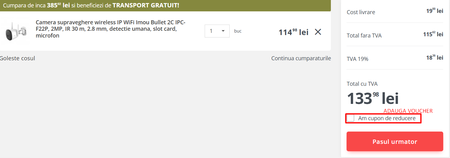 Sub lista cu produsele din cos vei vedea un camp special numit „Cod cupon” sau „Cod reducere”. Scrie sau lipeste codul promotional primit (ex: SPY10, REDUCERE20) si apasa pe butonul „Aplica”.