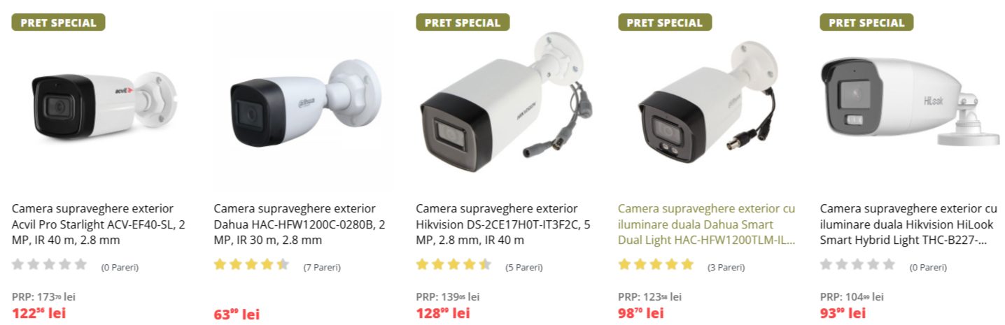 Printre produsele incluse in ofertele saptamanale se regasesc frecvent: camere de supraveghere IP sau analogice, kituri complete de securitate, microfoane spion, sisteme de alarma wireless, precum si accesorii precum HDD-uri, cabluri si surse de alimentare. Preturile pot incepe de la 49 RON si pot ajunge pana la 2.000 RON, in functie de produs si configuratie.