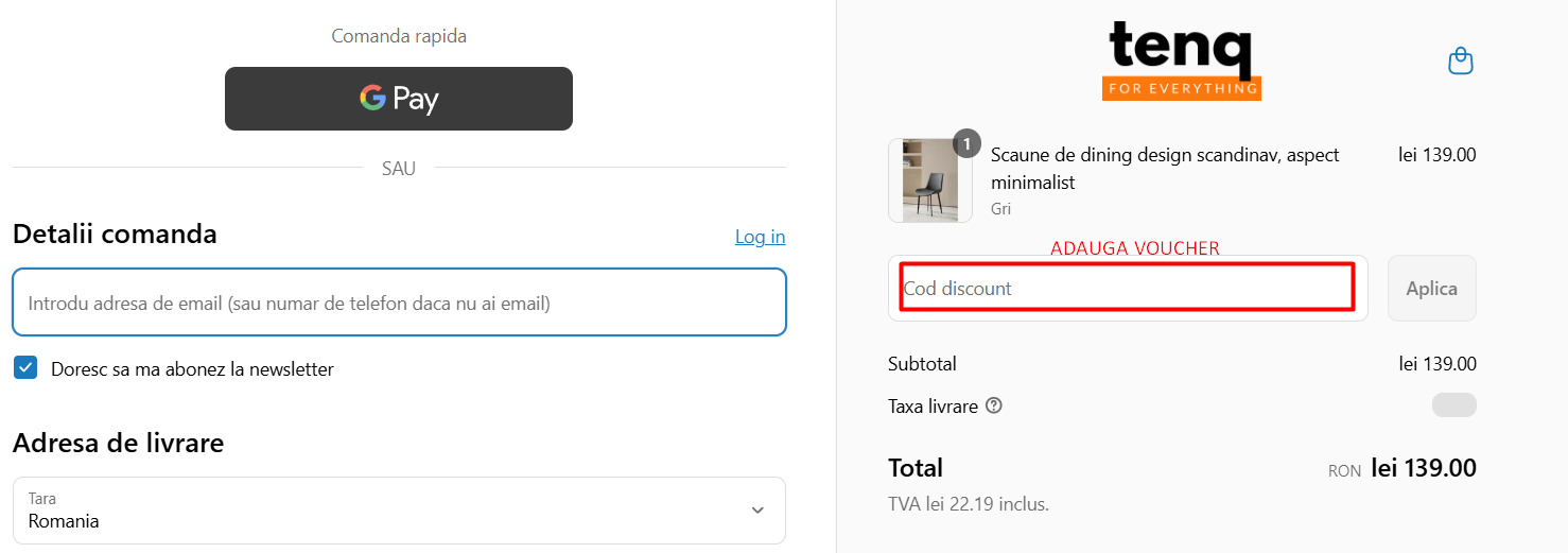 Dupa ce ai aplicat reducerea si verificat detaliile comenzii, completeaza informatiile necesare pentru livrare si alege metoda de plata preferata. Confirma comanda si asteapta e-mailul de confirmare.