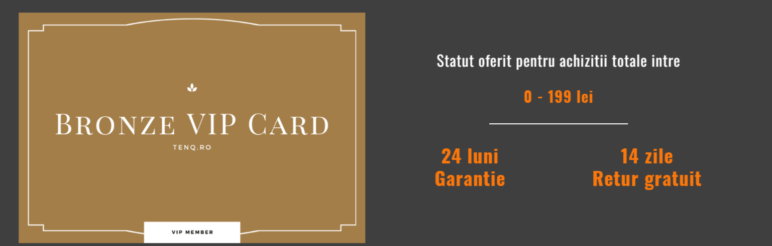 Club VIP Tenq este un program exclusiv de fidelizare oferit de Tenq.ro pentru clientii sai fideli. Membrii Club VIP beneficiaza de reduceri speciale de pana la 20% la toate comenzile, acces prioritar la promotii si oferte limitate, precum si livrare gratuita pentru comenzile de peste 199 lei. Inscrierea in club este gratuita pentru clientii care au plasat cel putin 3 comenzi in ultimele 6 luni.