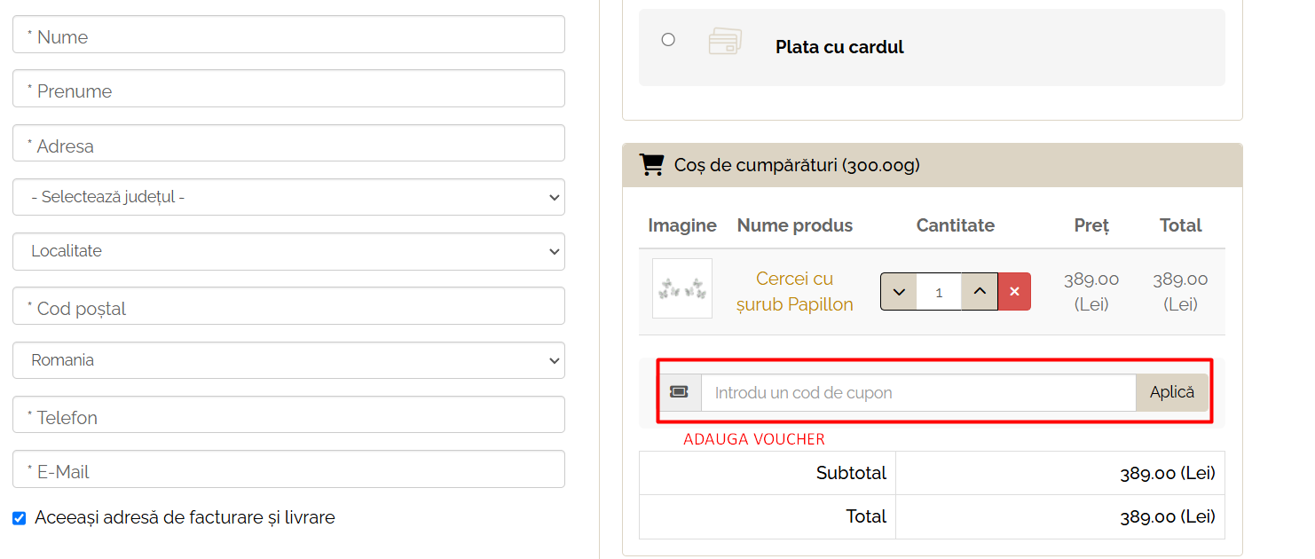 In pagina cosului de cumparaturi, veti gasi un camp special destinat codurilor promotionale sau voucherelor. Introduceti codul de reducere in acest camp si asigurati-va ca l-ati scris corect.