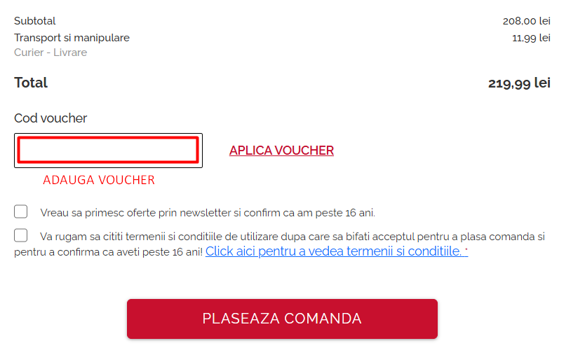 In pagina cosului, sub lista produselor selectate, vei gasi un camp special numit „Ai un cod de reducere?”. Introdu codul promotional exact asa cum l-ai primit (cu litere mari/mici si fara spatii), apoi apasa pe „Aplica codul”.