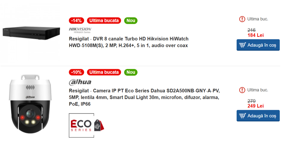 Cele mai populare produse aflate frecvent la reducere sunt: camere de supraveghere IP sau analogice, kituri de alarma wireless, automatizari pentru porti batante si culisante, videointerfoane, yale electromagnetice si control acces. Poti gasi accesorii utile (telecomenzi, senzori, cabluri) incepand de la 49 lei, iar kituri complete de la 399 lei. Produsele profesionale, destinate utilizarii comerciale, pot beneficia si ele de reduceri semnificative in cadrul ofertelor sezoniere.
