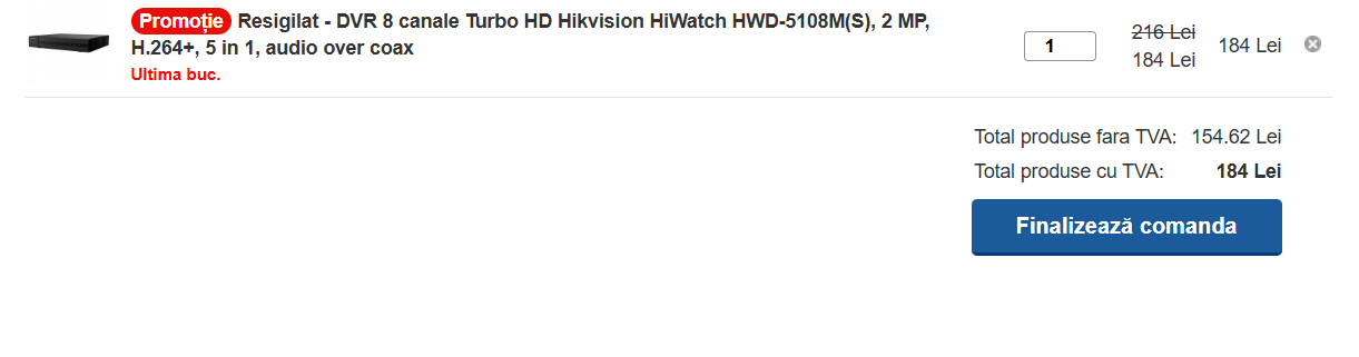 Produsele resigilate disponibile pe site includ o gama variata: camere de supraveghere, videointerfoane, kituri complete de automatizare, senzori, accesorii si centrale de alarma. Fiecare articol resigilat este insotit de o descriere clara a starii produsului si are o garantie de 12 luni, comparabila cu cea a produselor noi. In plus, comenzile care includ produse resigilate beneficiaza in continuare de transport gratuit pentru comenzi de peste 299 lei si de posibilitatea returnarii in termen de 14 zile.