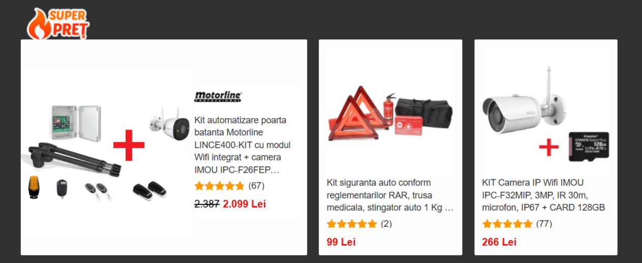 Pe VonMag, clientii pot gasi frecvent produse la super pret, cu reduceri semnificative de pana la 60% fata de pretul initial. De exemplu, un motor automatizare poarta batanta NICE WINGO2024KIT este disponibil la doar 1.299 lei, redus de la 2.099 lei, in timp ce un videointerfon complet Hikvision se vinde la 749 lei, fata de pretul standard de 1.099 lei. Produsele din categoriile populare – precum sisteme de alarma, camere IP, sau bariere auto – sunt adesea incluse in campanii de lichidare de stoc sau promotii temporare.