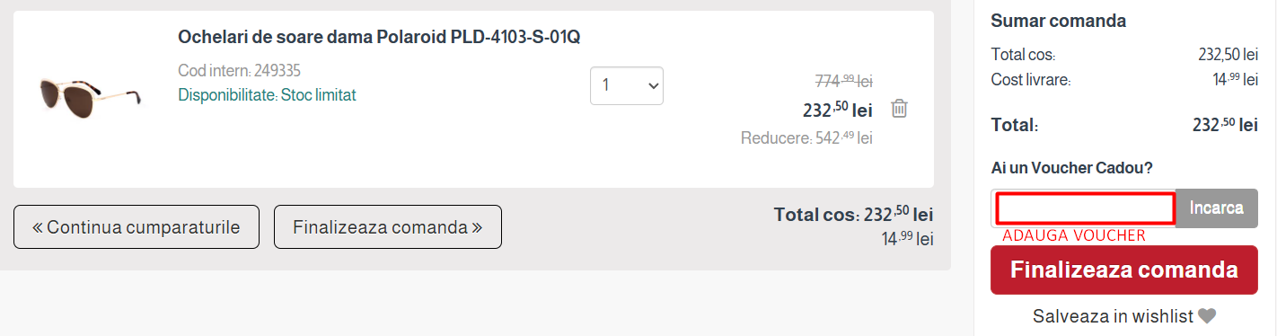 In campul dedicat „Cod de reducere” introdu voucherul primit si apasa butonul de aplicare pentru a vedea discountul in totalul comenzii.